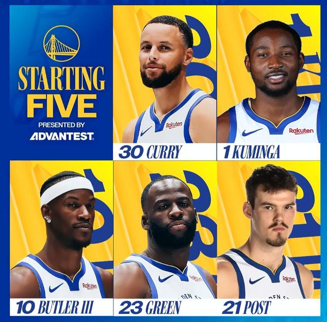 首发阵容方面,勇士队这边,科尔排出的最新首发五人组为:斯蒂芬-库里、吉米-巴特勒、乔纳森-库明加、德雷蒙德-格林、昆滕-波斯特;雄鹿队这边,首发阵容则为:莱恩-罗林斯、 小加里-特伦特、AJ-格林、凯尔-库兹马和迈尔斯-特纳。