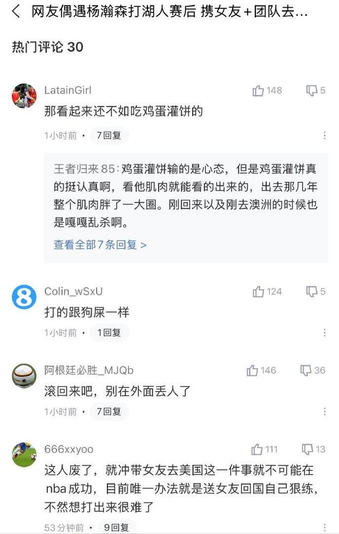 竞技体育,菜是原罪,只要你表现不好,做什么都是错的。与湖人队的比赛结束后,杨瀚森和女友在一家餐厅吃饭,照片被球迷发到了网上,评论区一片质疑。“打得狗屎一样”,“滚回来吧,别在外面丢人了”,“这人废了,就冲带女友去NBA不可能成功”,“为什么赛后不加练?从来没有看到你加练”,“英语都不会,什么都靠翻译,利拉德和教练的话都听不懂”,很多类似网暴杨瀚森的话。
