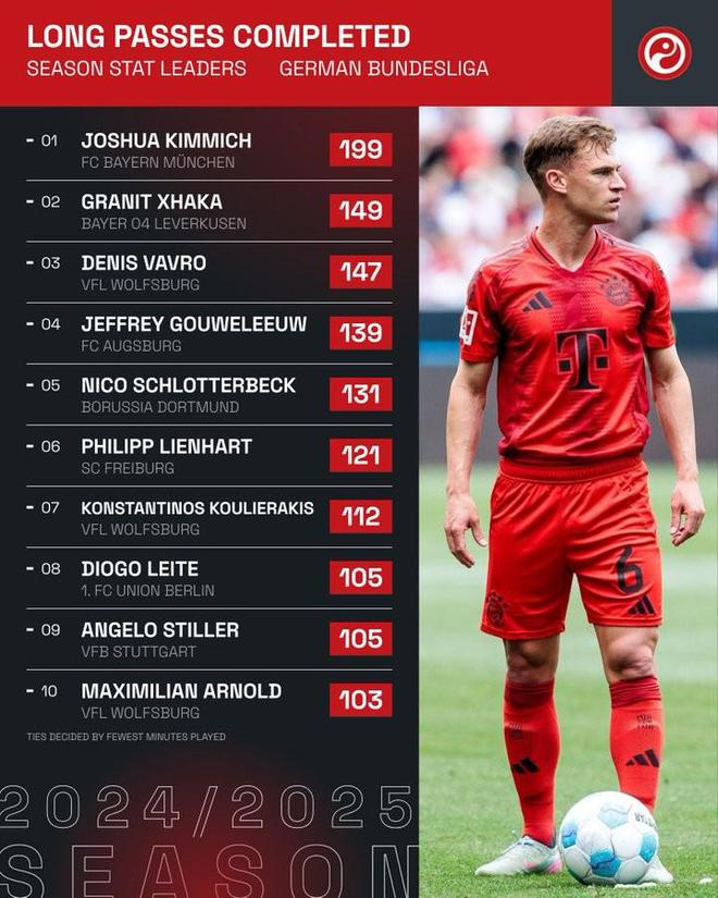 本赛季德甲成功长传球员榜:基米希199次居首,扎卡第二