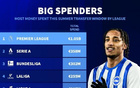 德转列今夏各联赛支出榜:英超10.5亿居首,意德西法共计10.28亿
